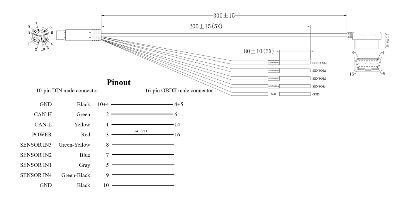 | Connector Type | 10-pin DIN to 16-pin OBD-II |